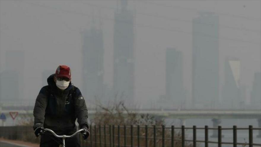 Un ciclista en Seúl, la capital surcoreana, afectada por alto nivel de contaminación.